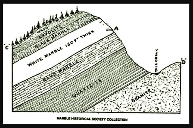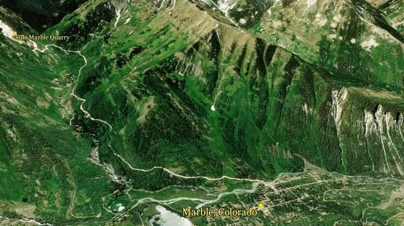 High in the Rockies, over 9,000 feet above sea level, is the only place on Earth where Colorado Yule Marble is found: Yule Creek Valley near Marble, Colorado.