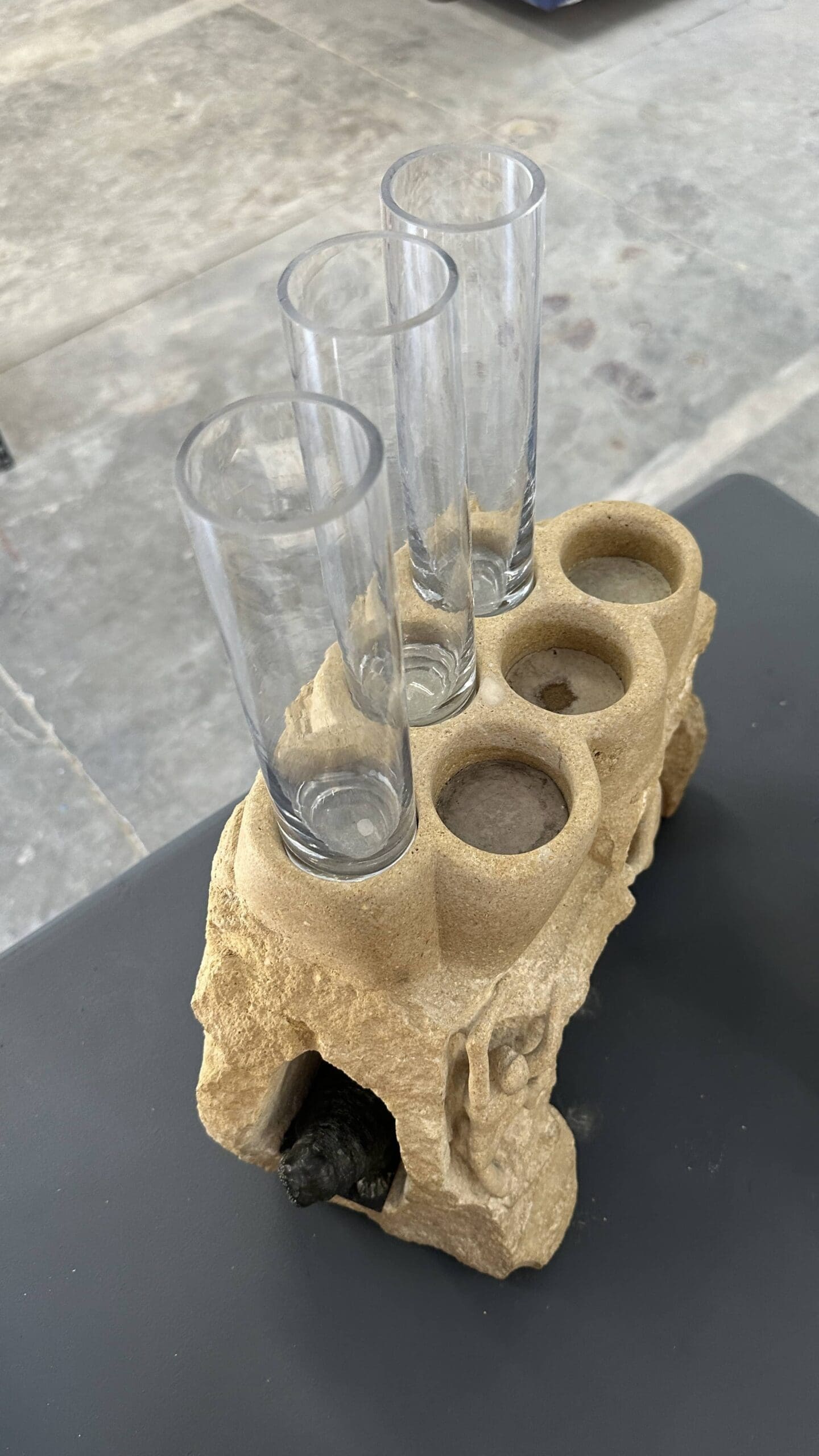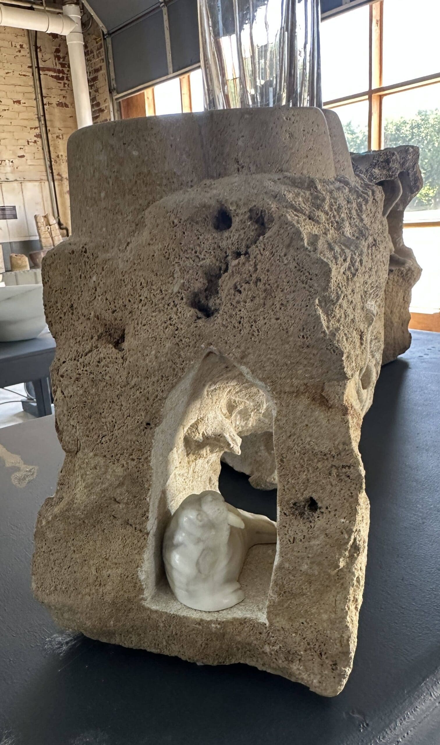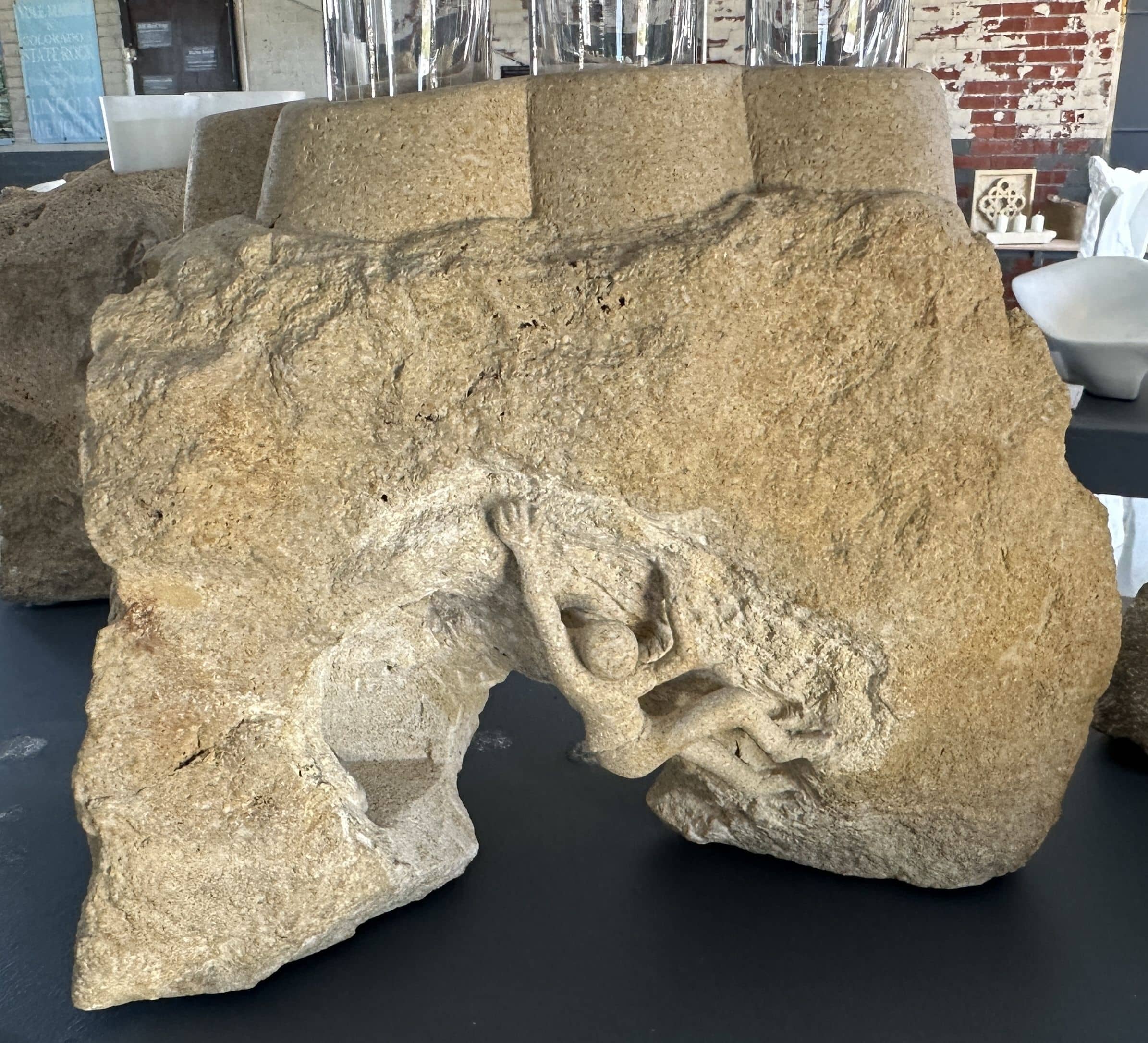 In The Crux, three determined climbers scale a rugged limestone arch, each frozen in a moment of effort and balance. Carved directly into the stone, their stylized forms emphasize the shared struggle and individual challenge of the ascent. At the base, hidden in the shadows of carved grottos, animal figurines—like a lounging walrus and watchful black dog—add a sense of quiet wonder to the piece. Crowned with candle or glass holders, the sculpture invites both literal and metaphorical illumination. As the second in the Climbers series, The Crux captures a pivotal moment—when the next move is unclear, and commitment is everything.
