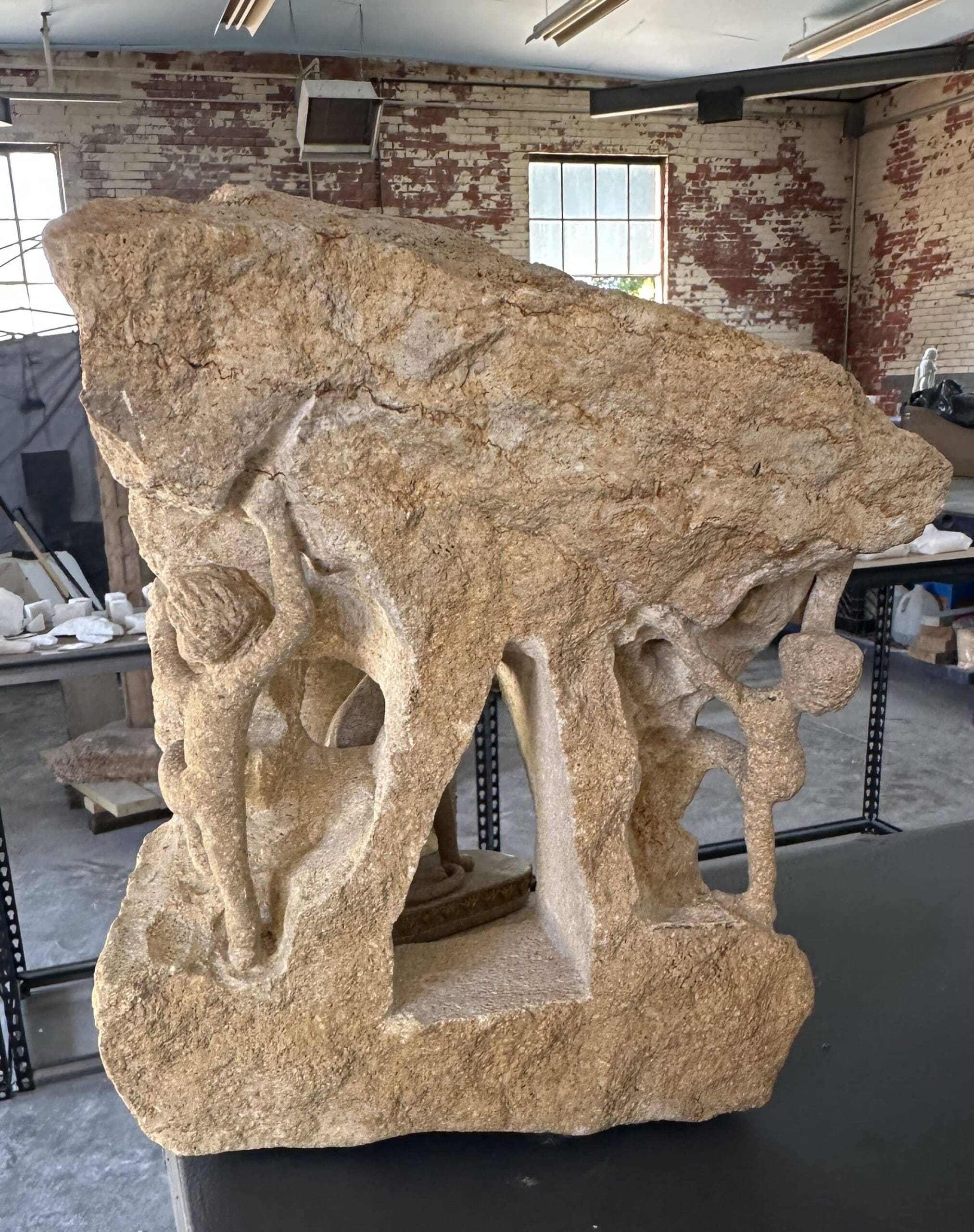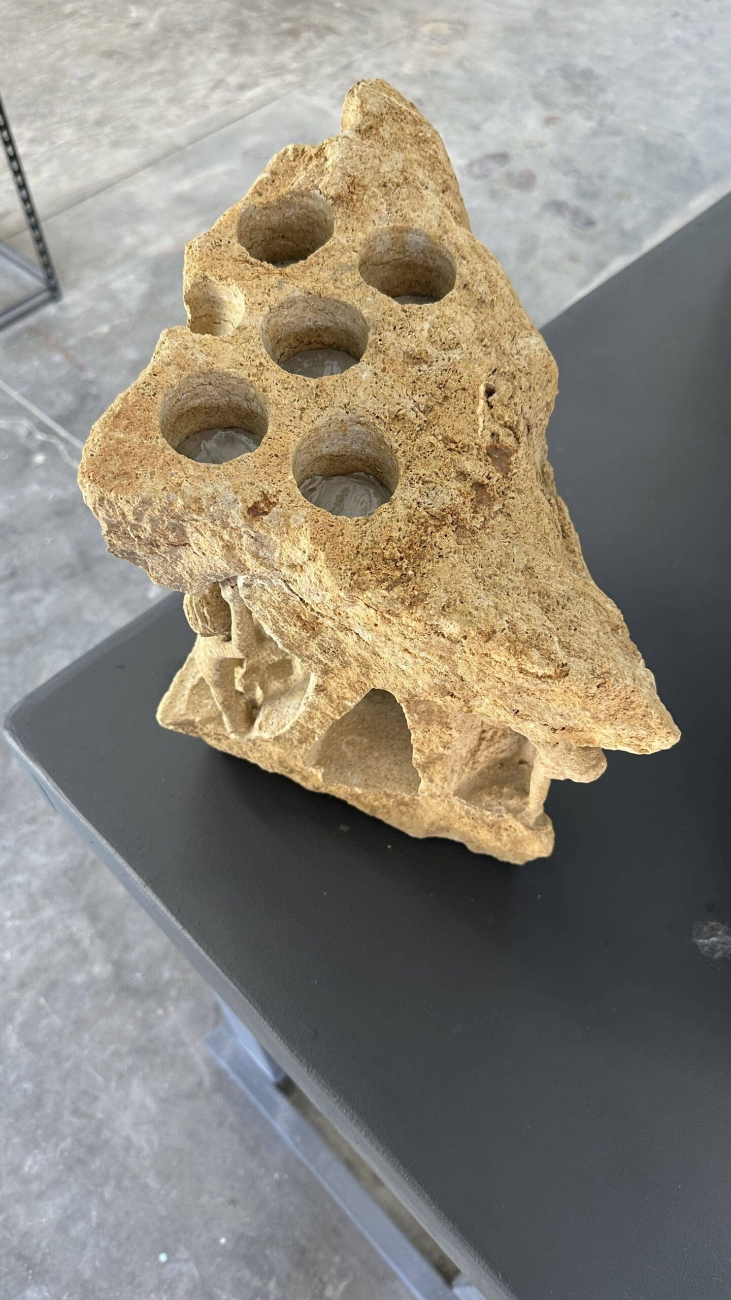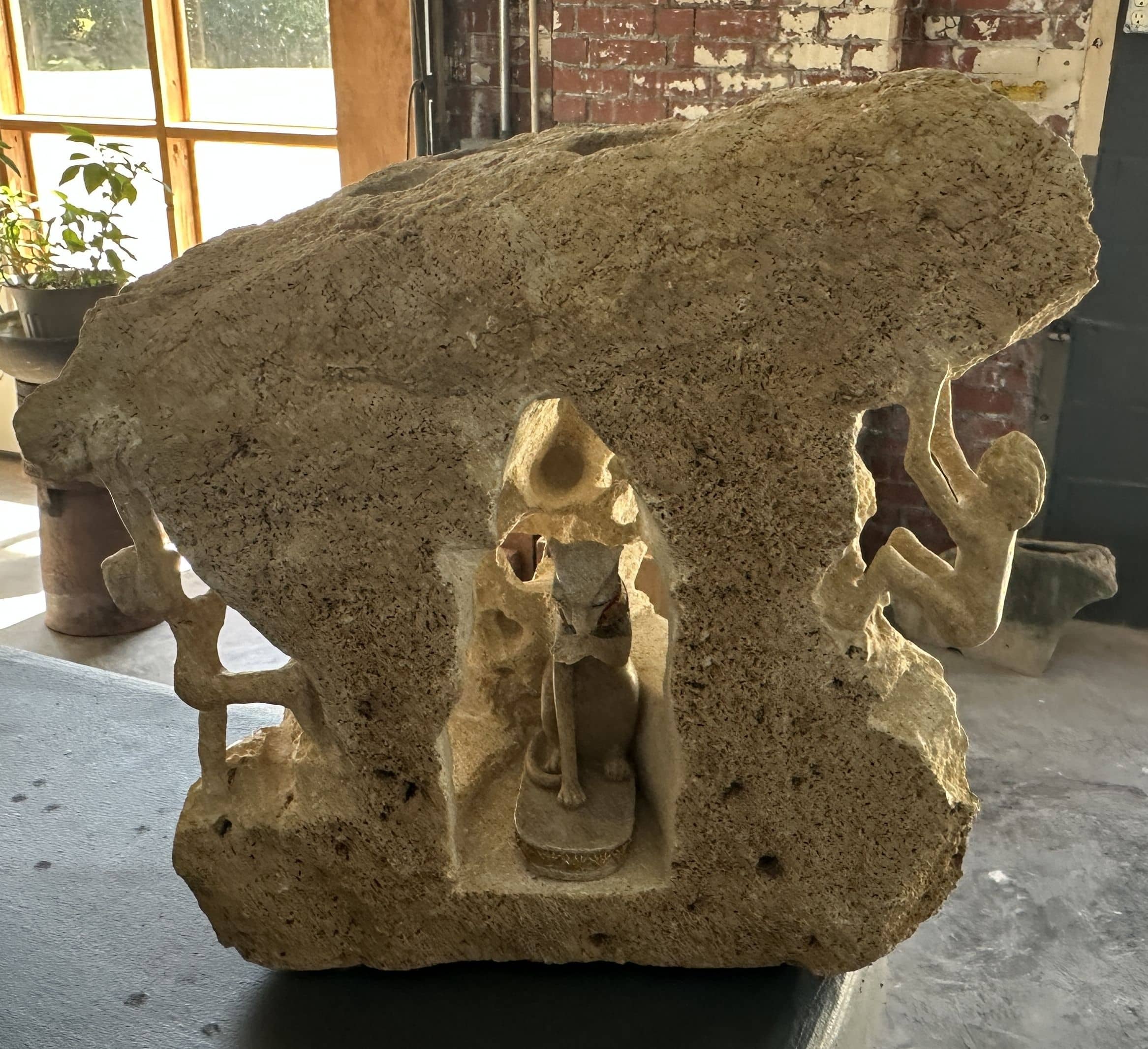 The final work in the Climbers series, The Watcher brings the journey full circle. Four climbers scale the jagged limestone from every direction, their limbs stretched toward uncertain heights. At the heart of the sculpture sits a poised feline figure—serene, regal, and unmoved—resting within a central niche like a quiet guardian. With its angled peak and six candle ports, the piece forms a spiritual monument to persistence, balance, and mystery. The climbers strive, but the cat watches. Who reaches the summit, and who already owns it?