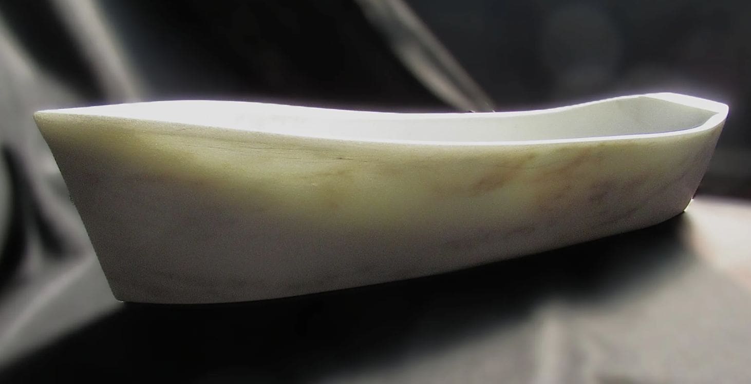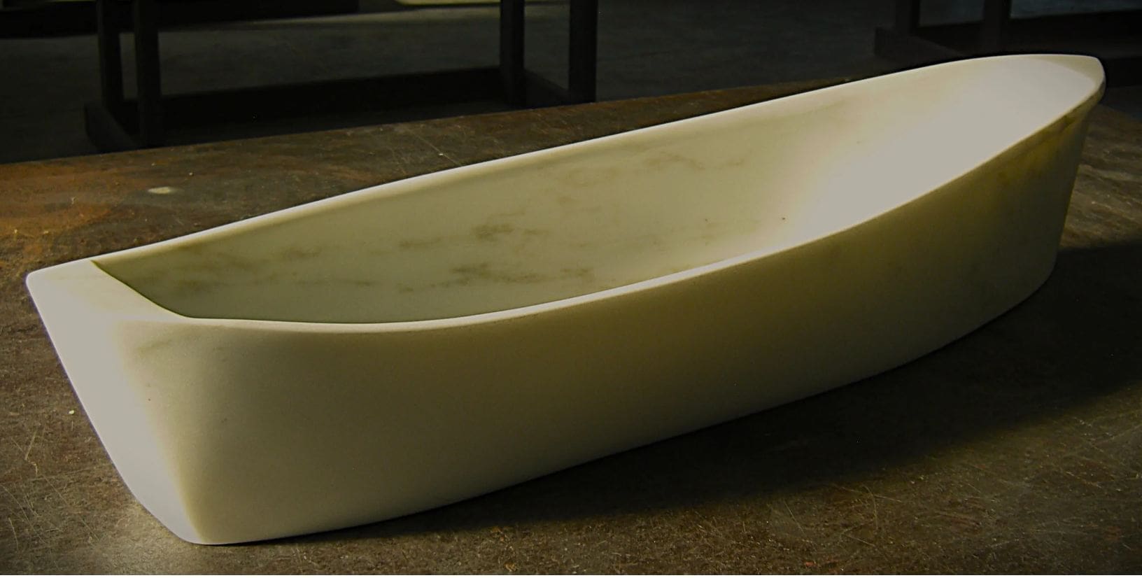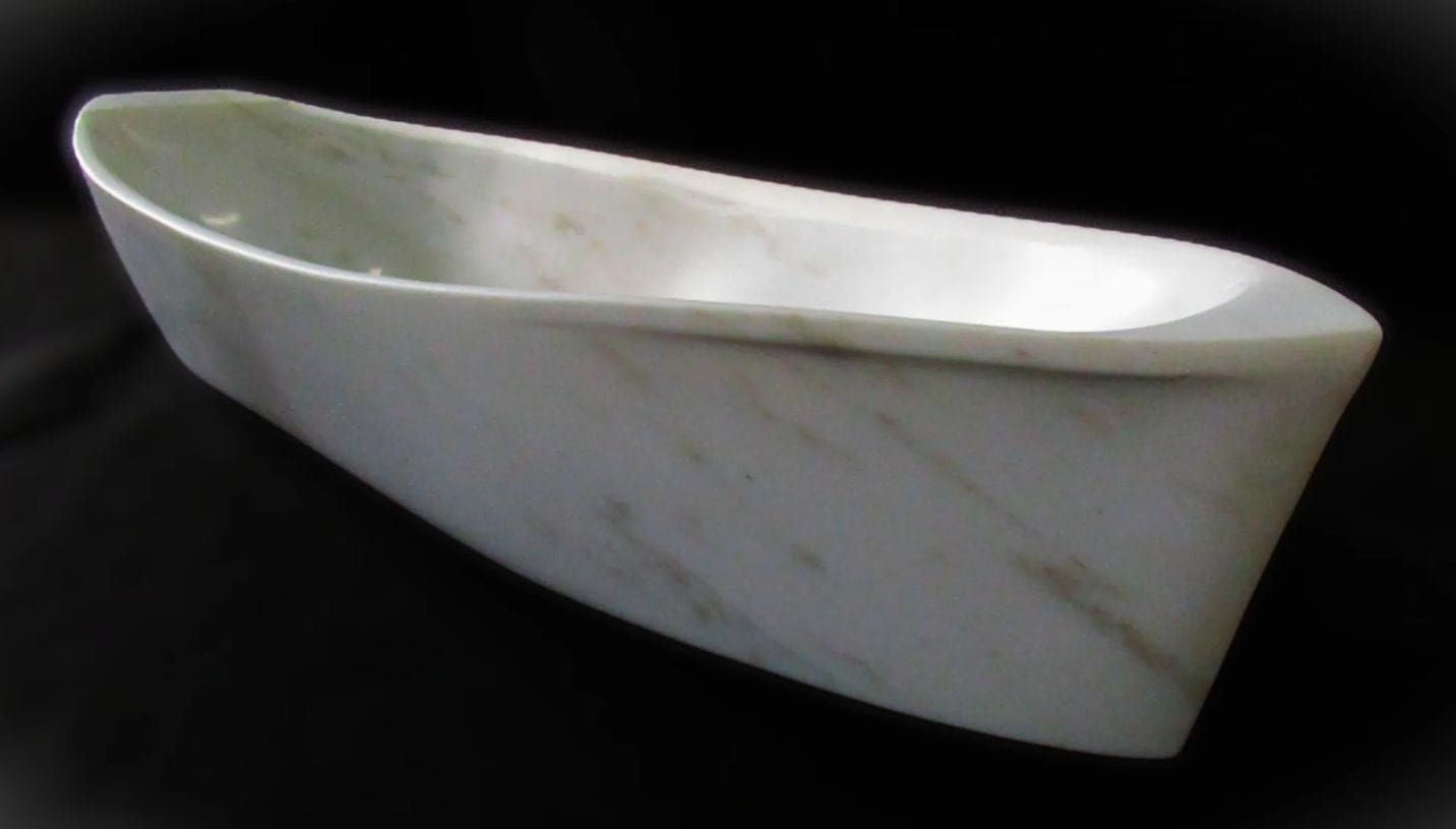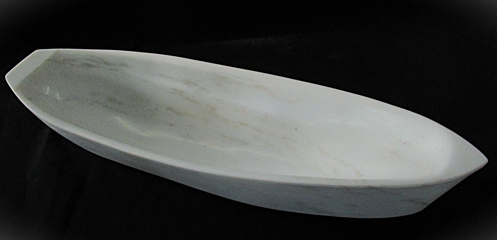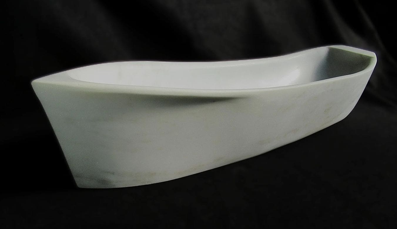 Lucky Scylla is both sculpture and homage—a sleek, marble vessel carved in tribute to Martin Cooney’s father and the ship he served aboard during World War II, the HMS Scylla. Fashioned from a long, elegant block of Colorado Yule Marble, its form evokes the clean lines of a warship hull, refined yet steadfast. Subtle veining and a luminous white finish lend the piece a sense of grace, while its deliberate weight and polish speak to endurance and purpose. It is, in Cooney’s words, “a humble tribute to a great, great warship,” and to the steadfast men who sailed her.