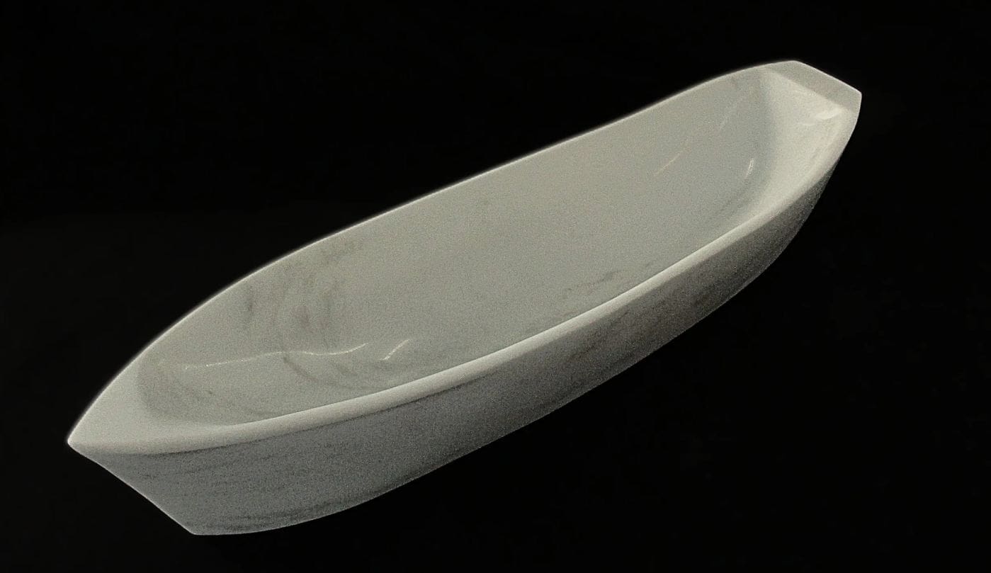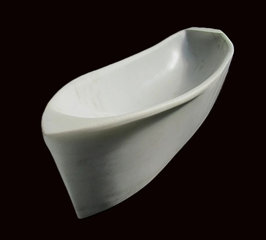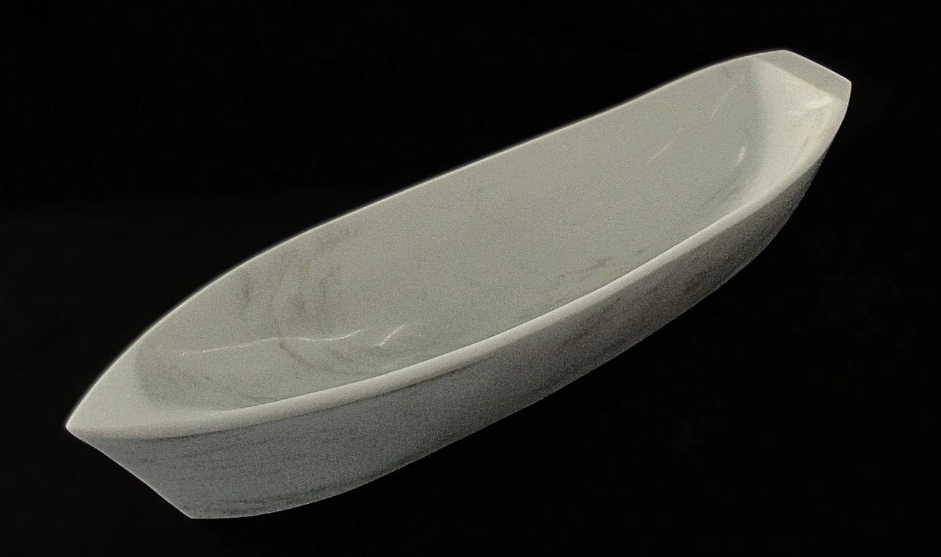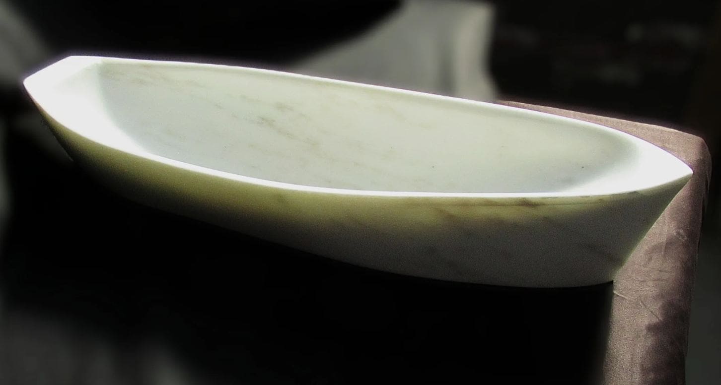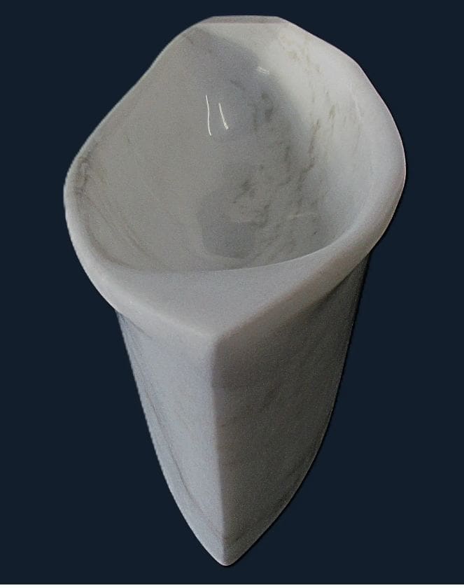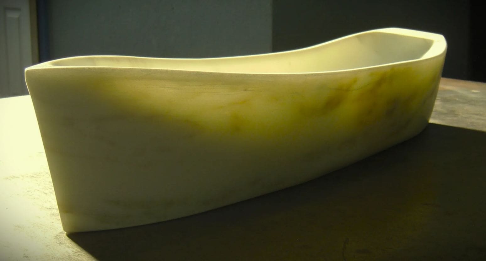 Lucky Scylla is both sculpture and homage—a sleek, marble vessel carved in tribute to Martin Cooney’s father and the ship he served aboard during World War II, the HMS Scylla. Fashioned from a long, elegant block of Colorado Yule Marble, its form evokes the clean lines of a warship hull, refined yet steadfast. Subtle veining and a luminous white finish lend the piece a sense of grace, while its deliberate weight and polish speak to endurance and purpose. It is, in Cooney’s words, “a humble tribute to a great, great warship,” and to the steadfast men who sailed her.