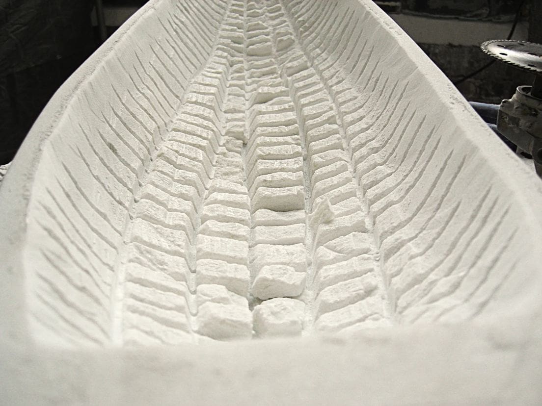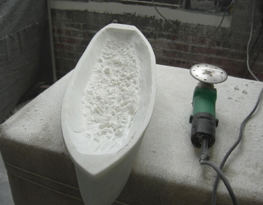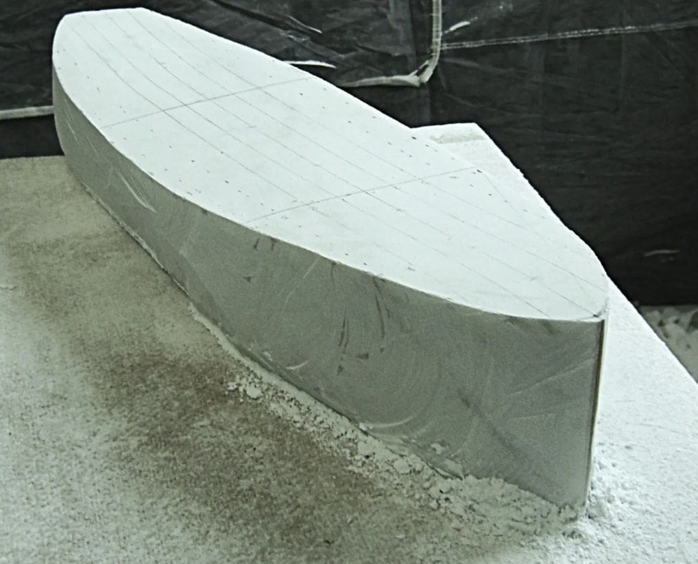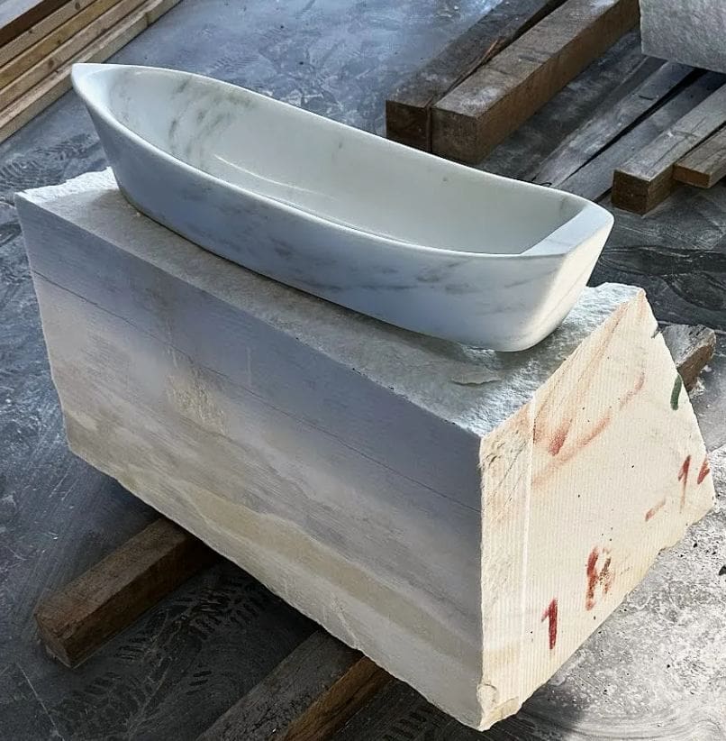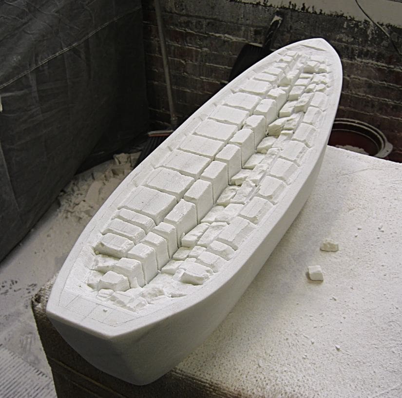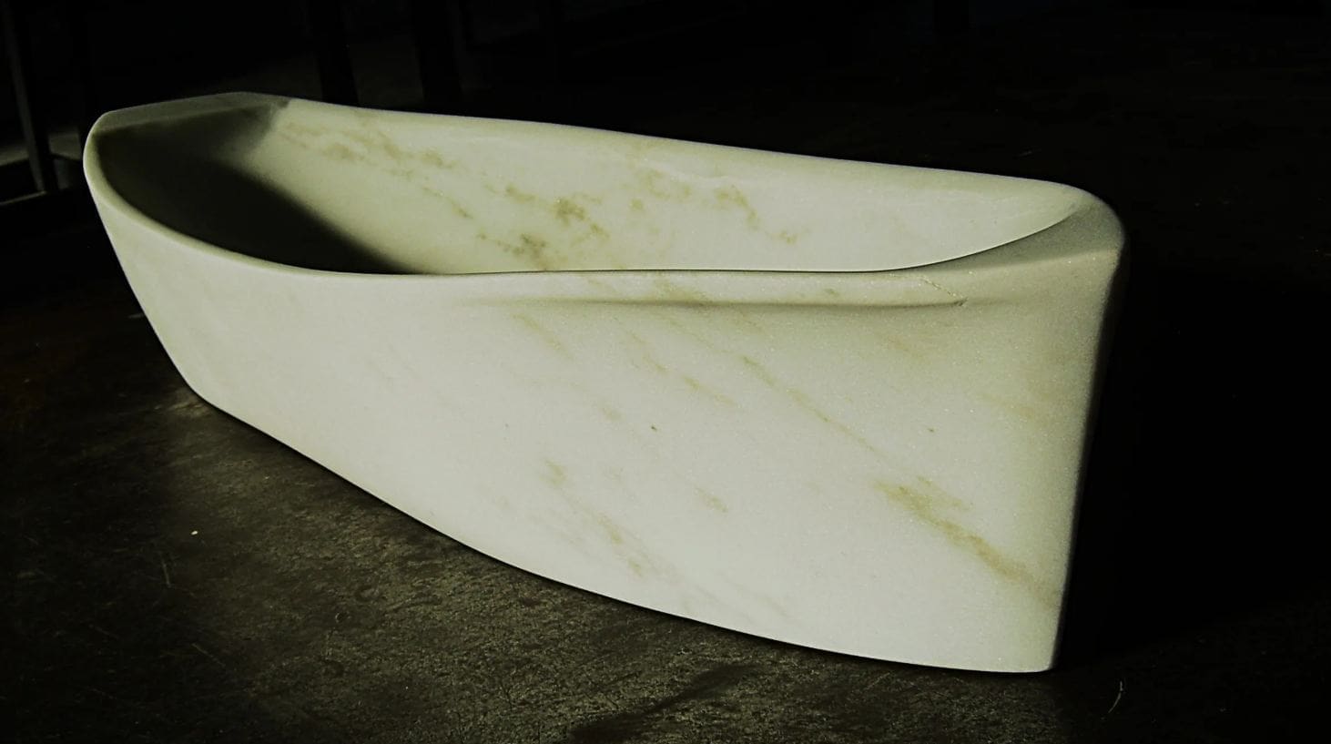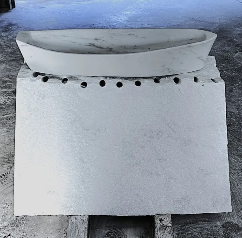 Lucky Scylla is both sculpture and homage—a sleek, marble vessel carved in tribute to Martin Cooney’s father and the ship he served aboard during World War II, the HMS Scylla. Fashioned from a long, elegant block of Colorado Yule Marble, its form evokes the clean lines of a warship hull, refined yet steadfast. Subtle veining and a luminous white finish lend the piece a sense of grace, while its deliberate weight and polish speak to endurance and purpose. It is, in Cooney’s words, “a humble tribute to a great, great warship,” and to the steadfast men who sailed her.