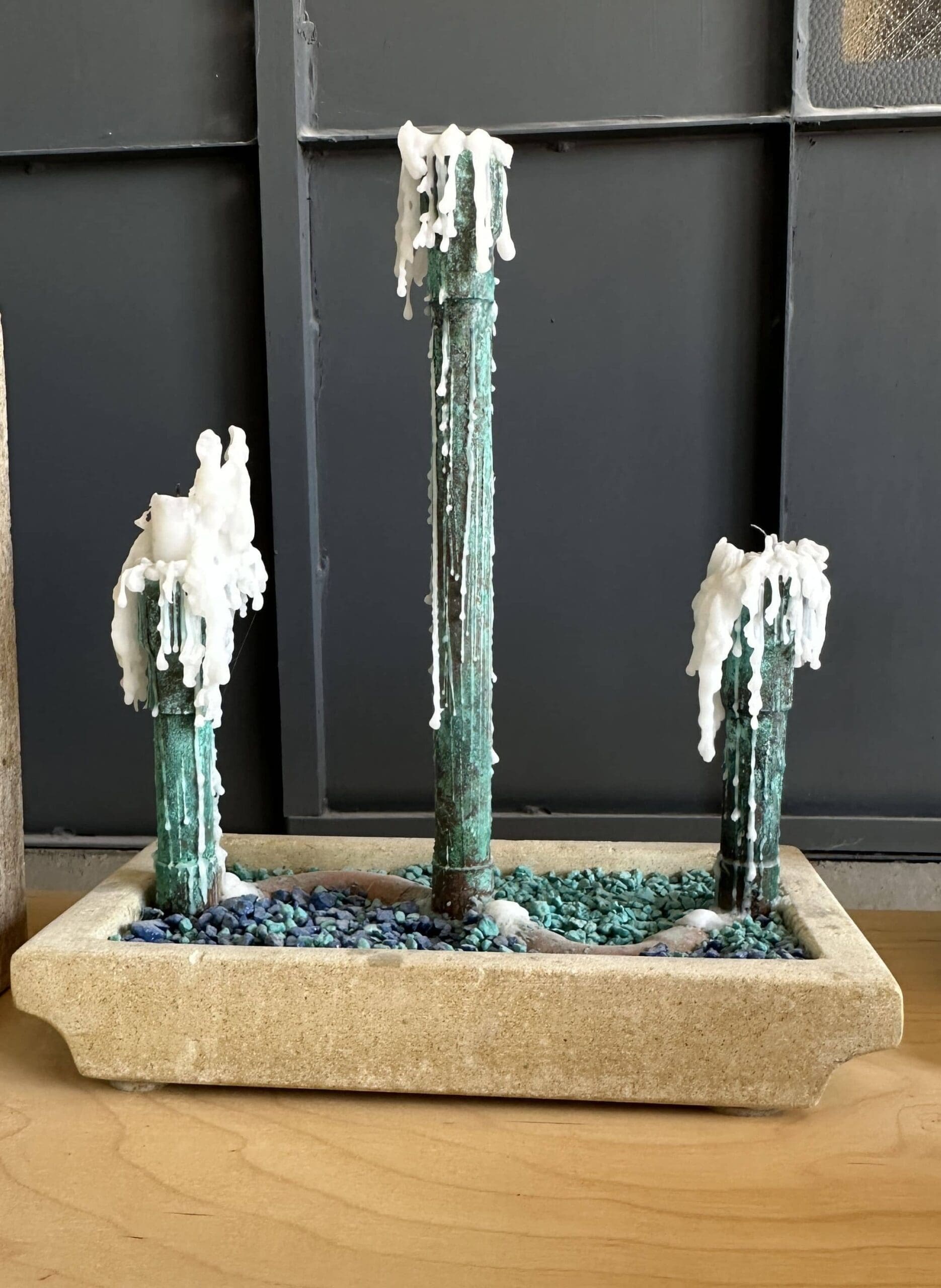 Three slender copper pillars rise from a bed of crushed turquoise gravel, each uniquely oxidized to a rich green patina. Mounted in a hand-carved Kansas Crème limestone tray, the sculpture doubles as a dramatic candle holder and a statement piece of rustic-modern design.