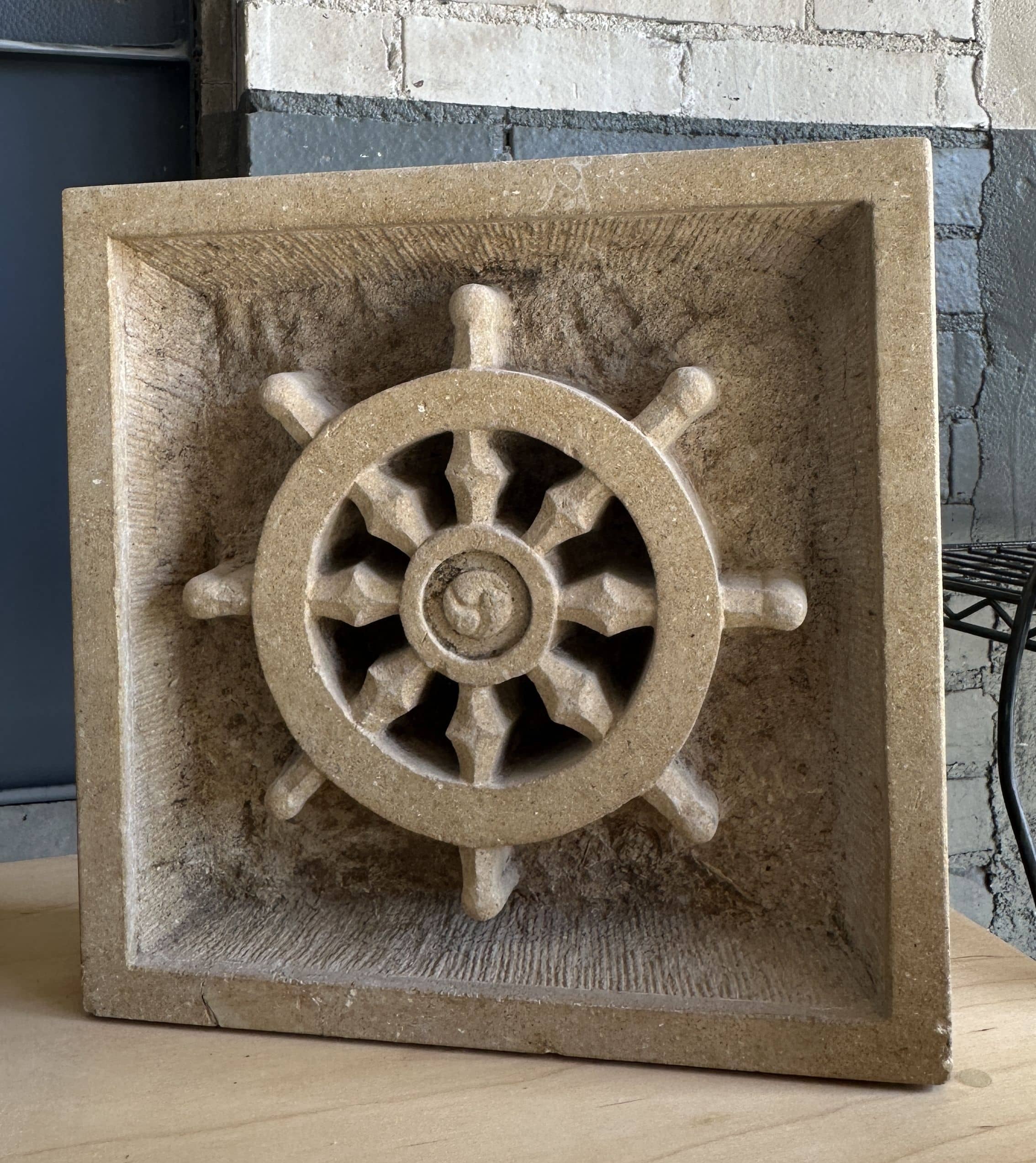 Framed in a recessed square panel, this limestone carving presents the Dharmachakra — the Wheel of Dharma — a sacred symbol in Buddhism that represents the Buddha’s teachings and the path to enlightenment.