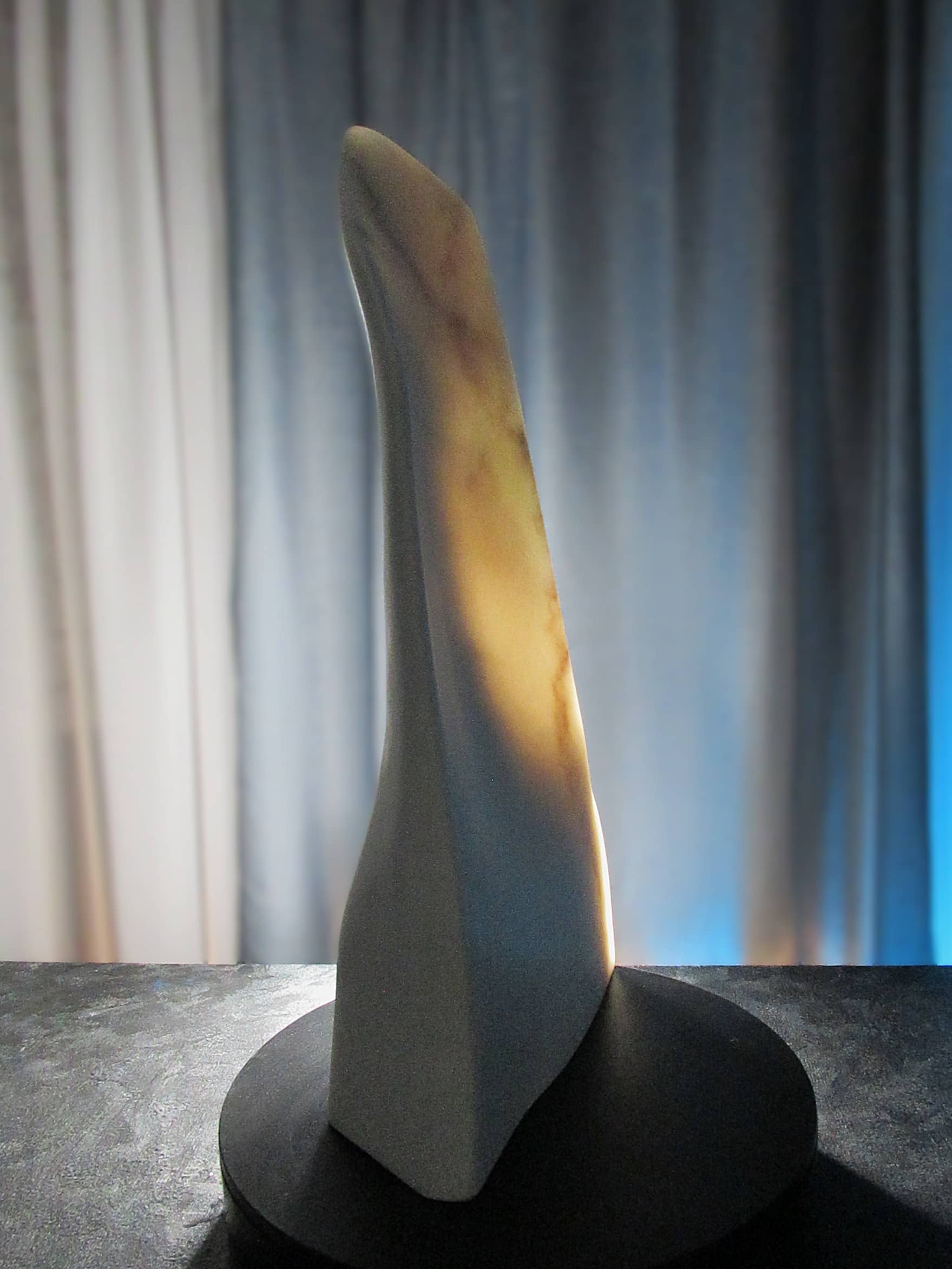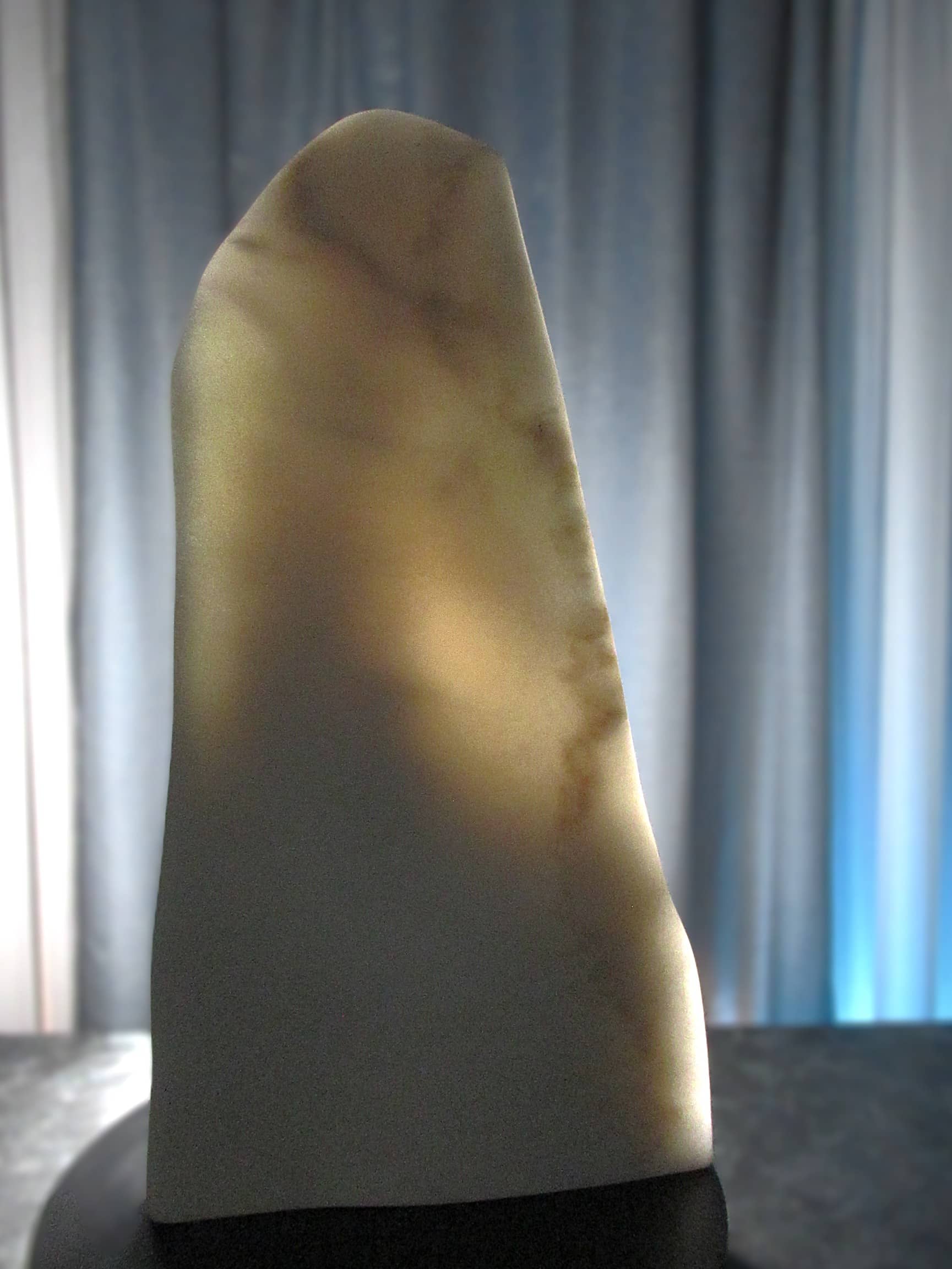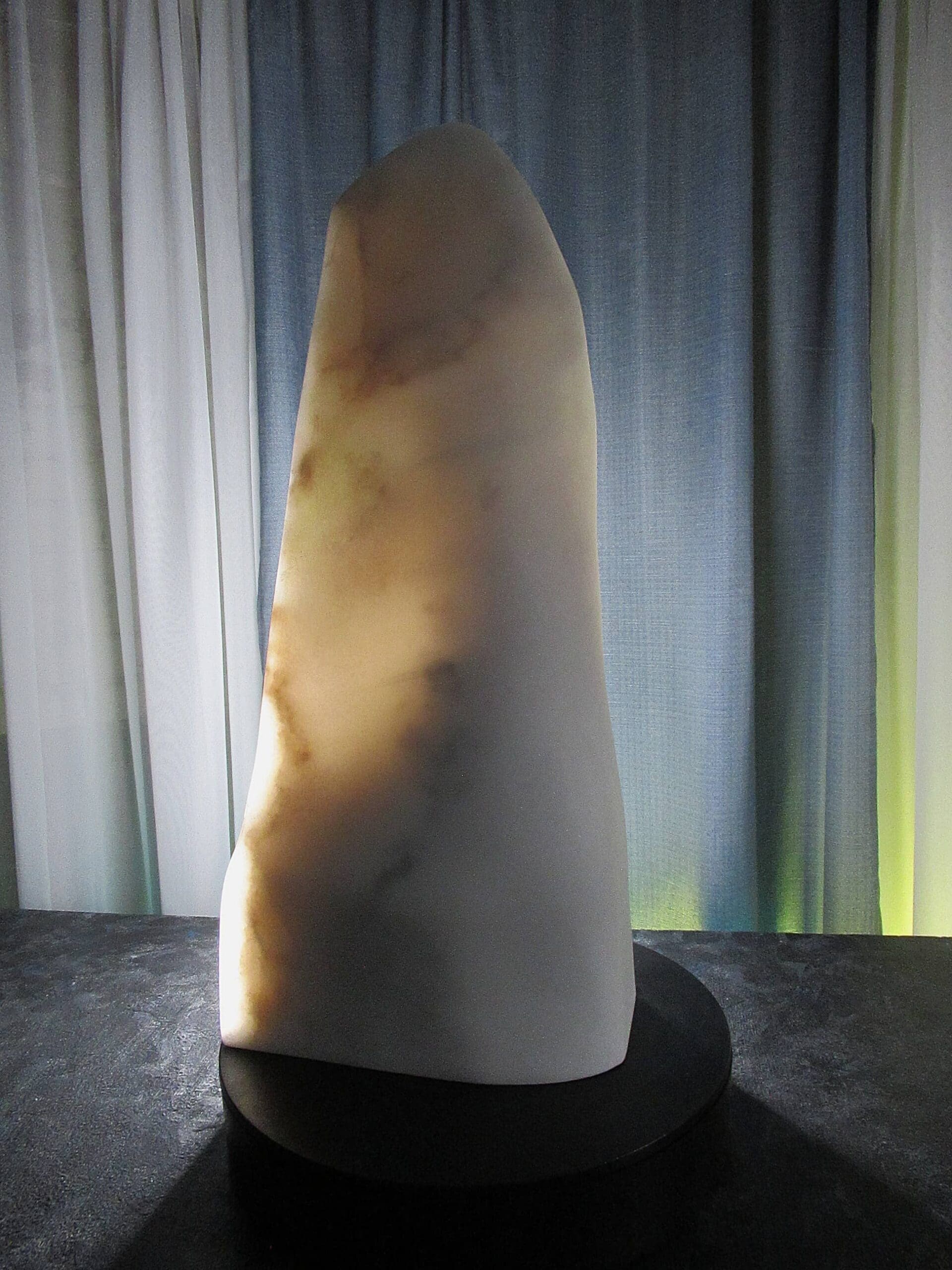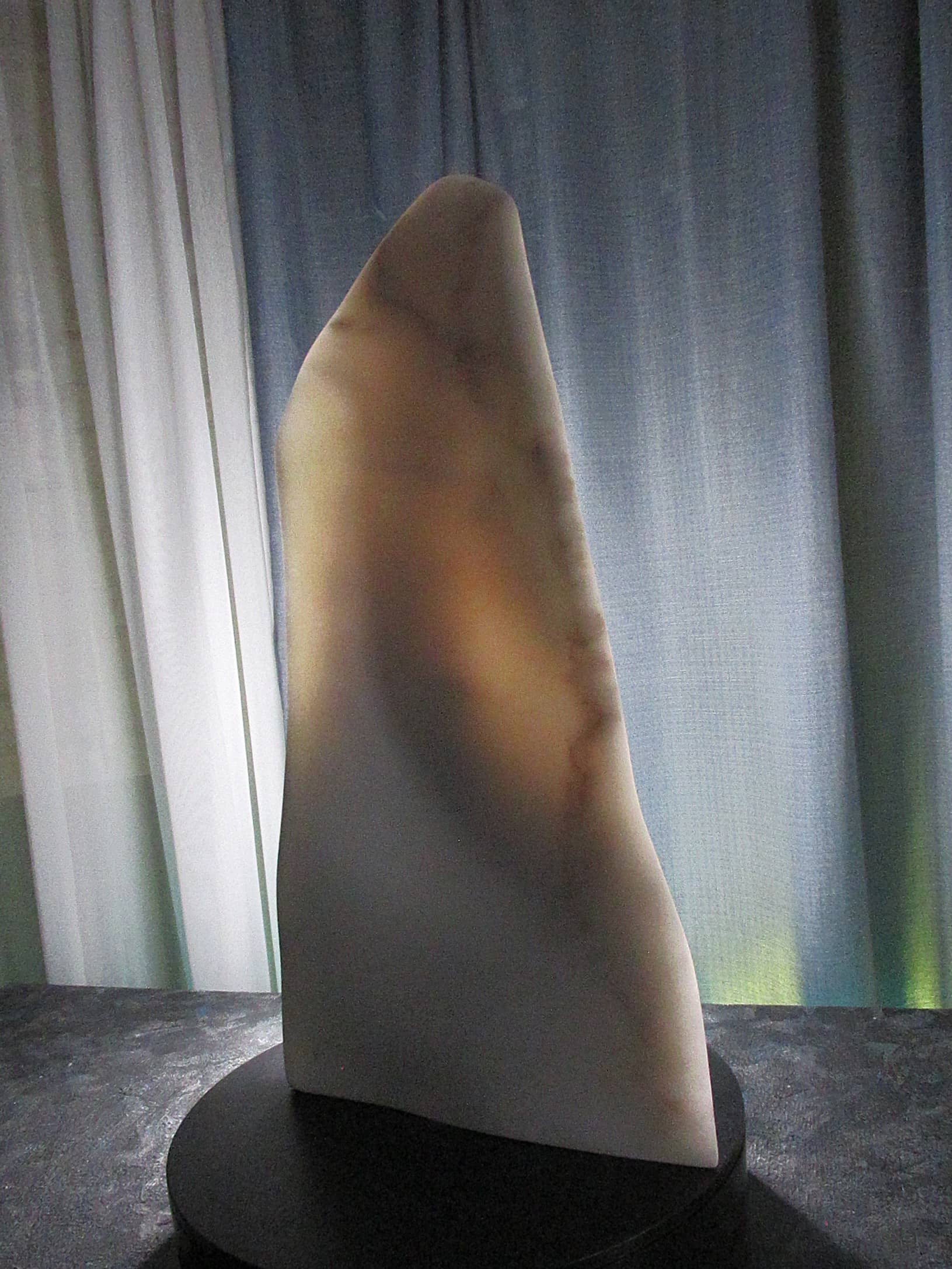 Vanishing Point reveals one of marble’s rarest qualities—its ability to transmit light. Carved as an ultra-thin sliver of Colorado Yule Marble, the sculpture allows light to pass through the stone, transforming solid marble into a shifting field of color, shadow, and translucence.