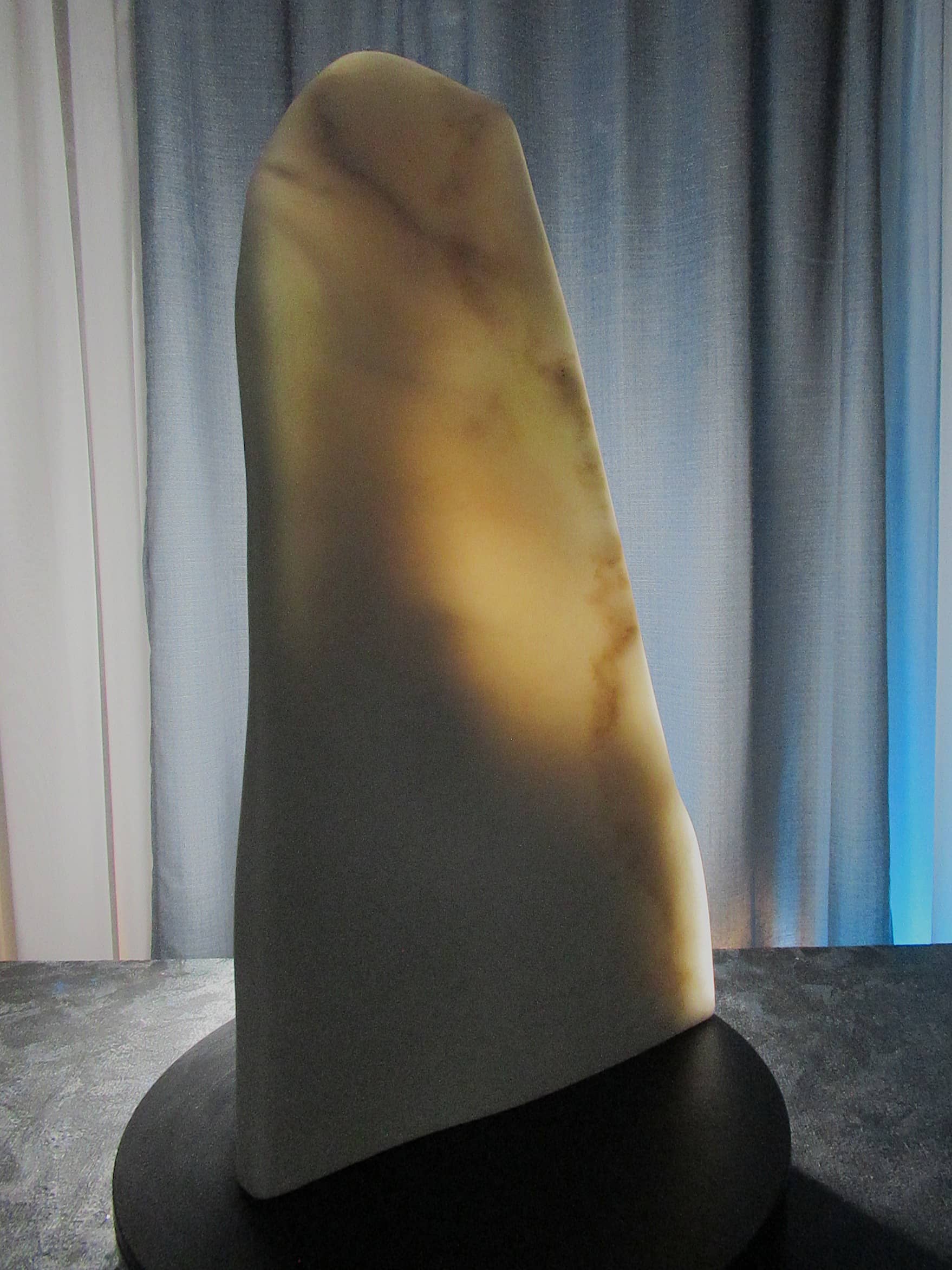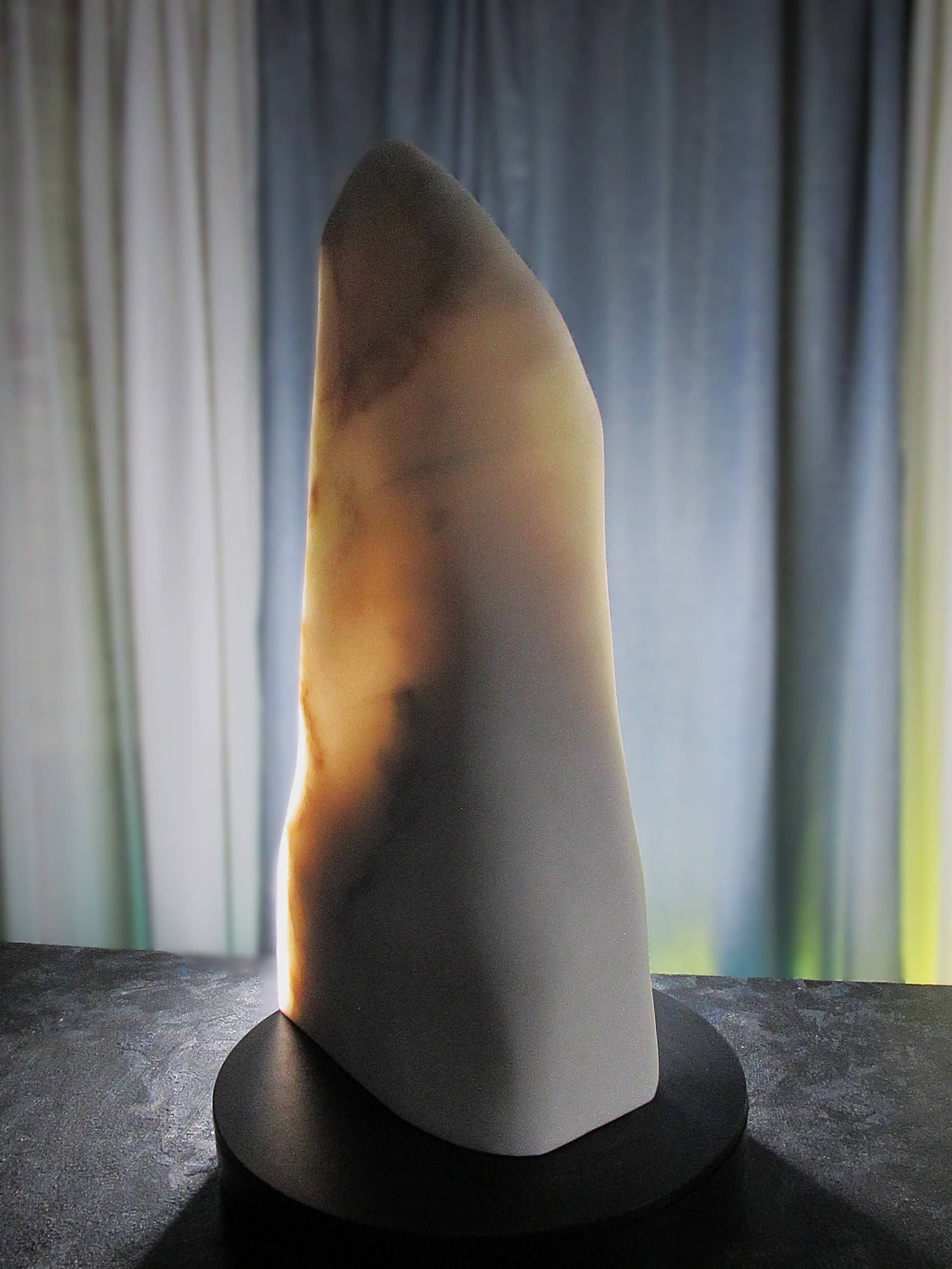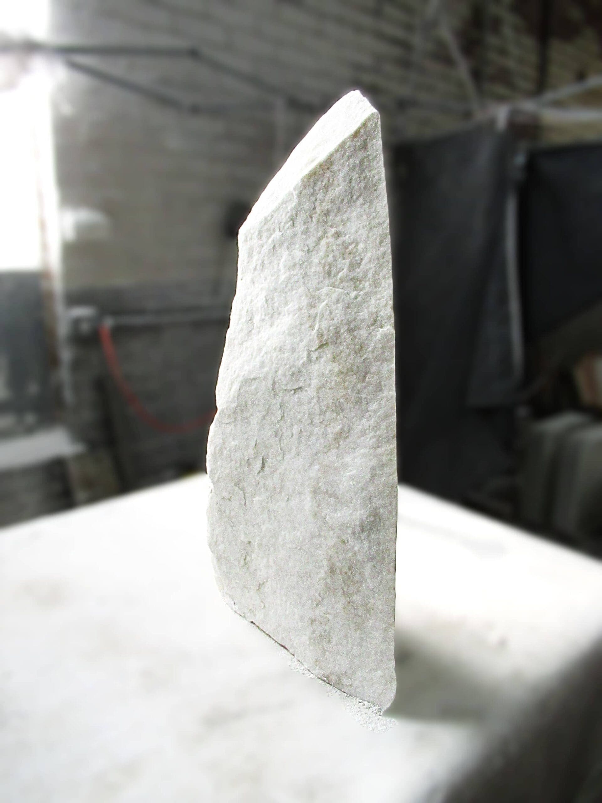 Vanishing Point reveals one of marble’s rarest qualities—its ability to transmit light. Carved as an ultra-thin sliver of Colorado Yule Marble, the sculpture allows light to pass through the stone, transforming solid marble into a shifting field of color, shadow, and translucence.