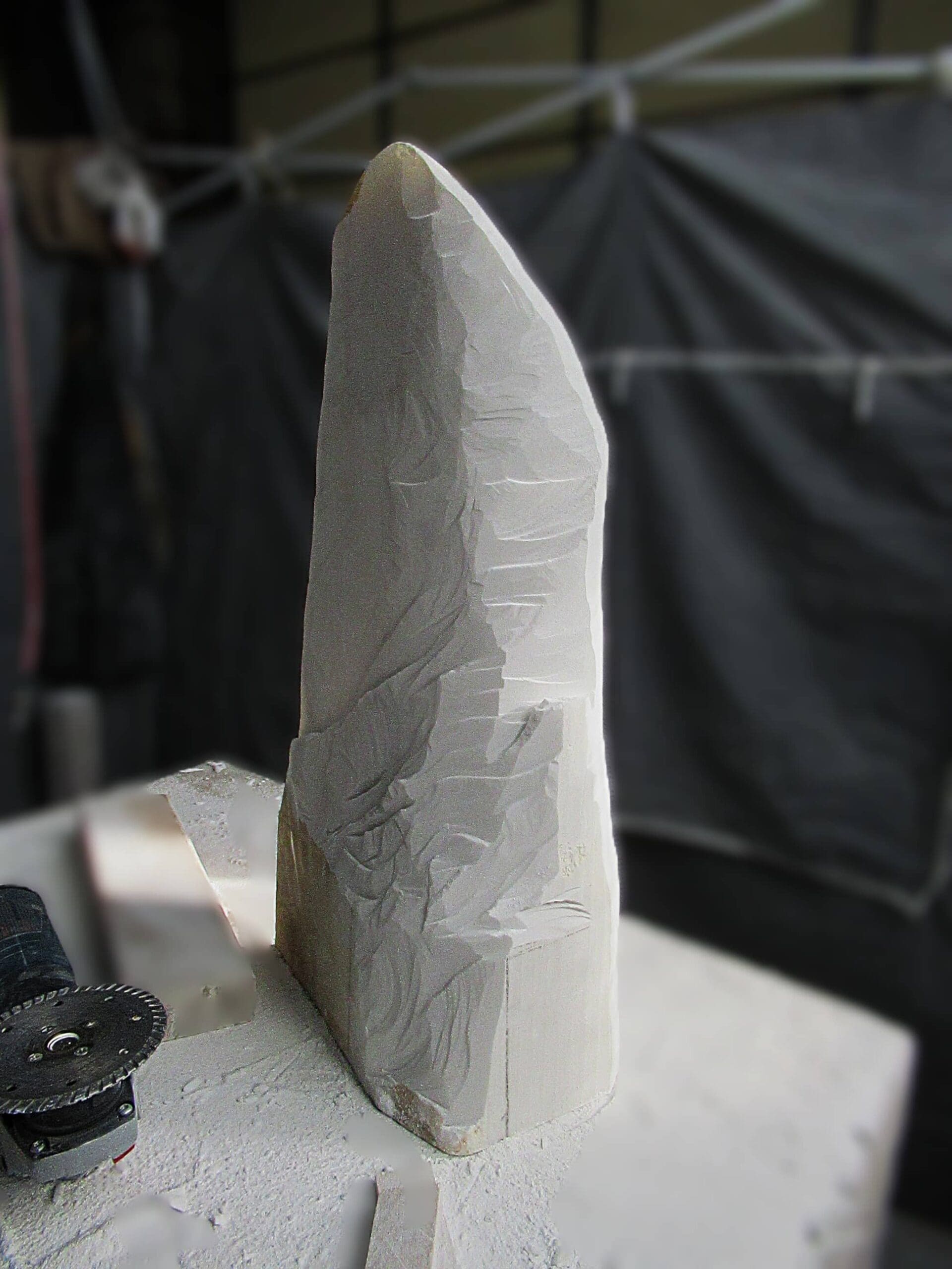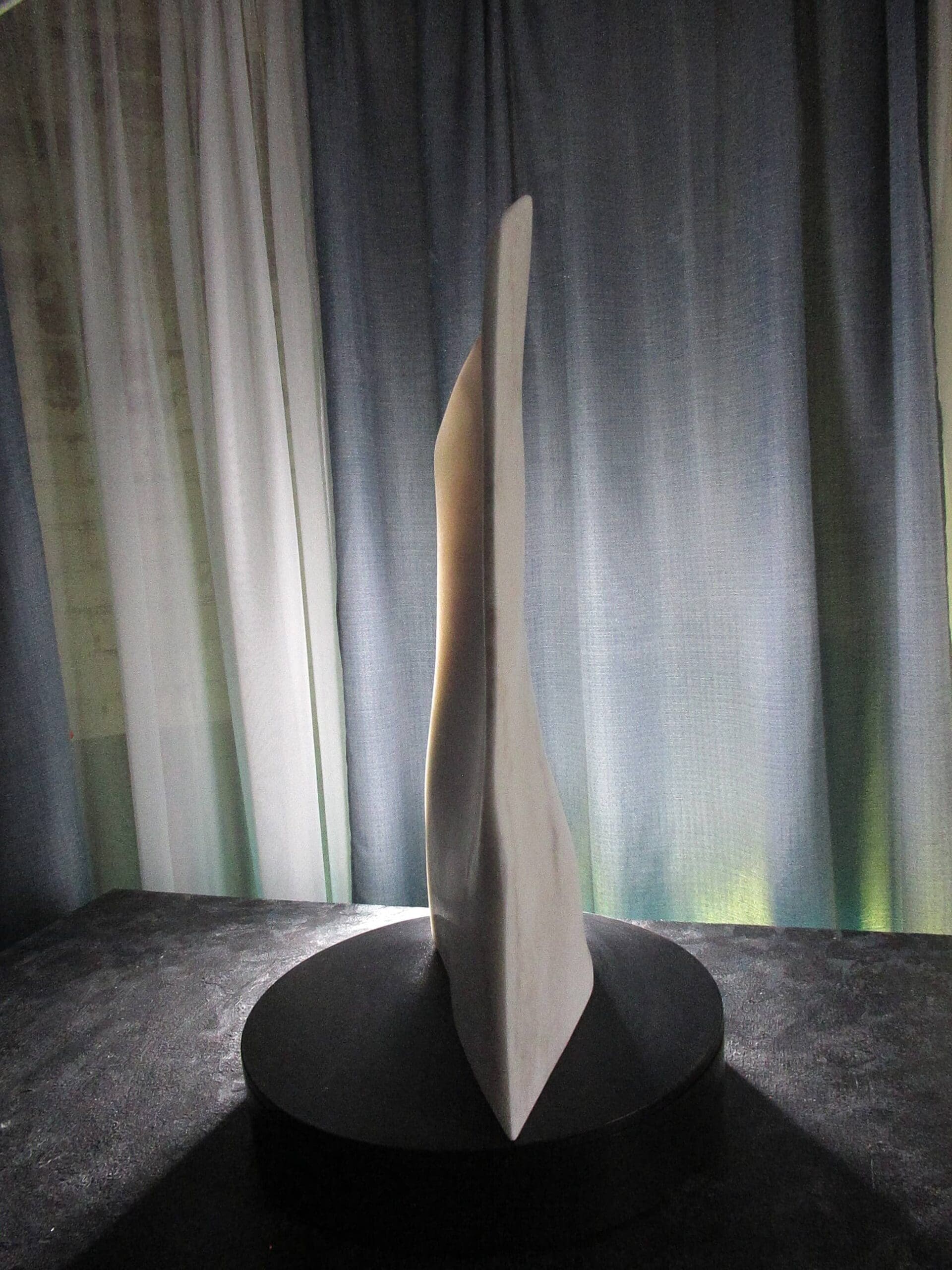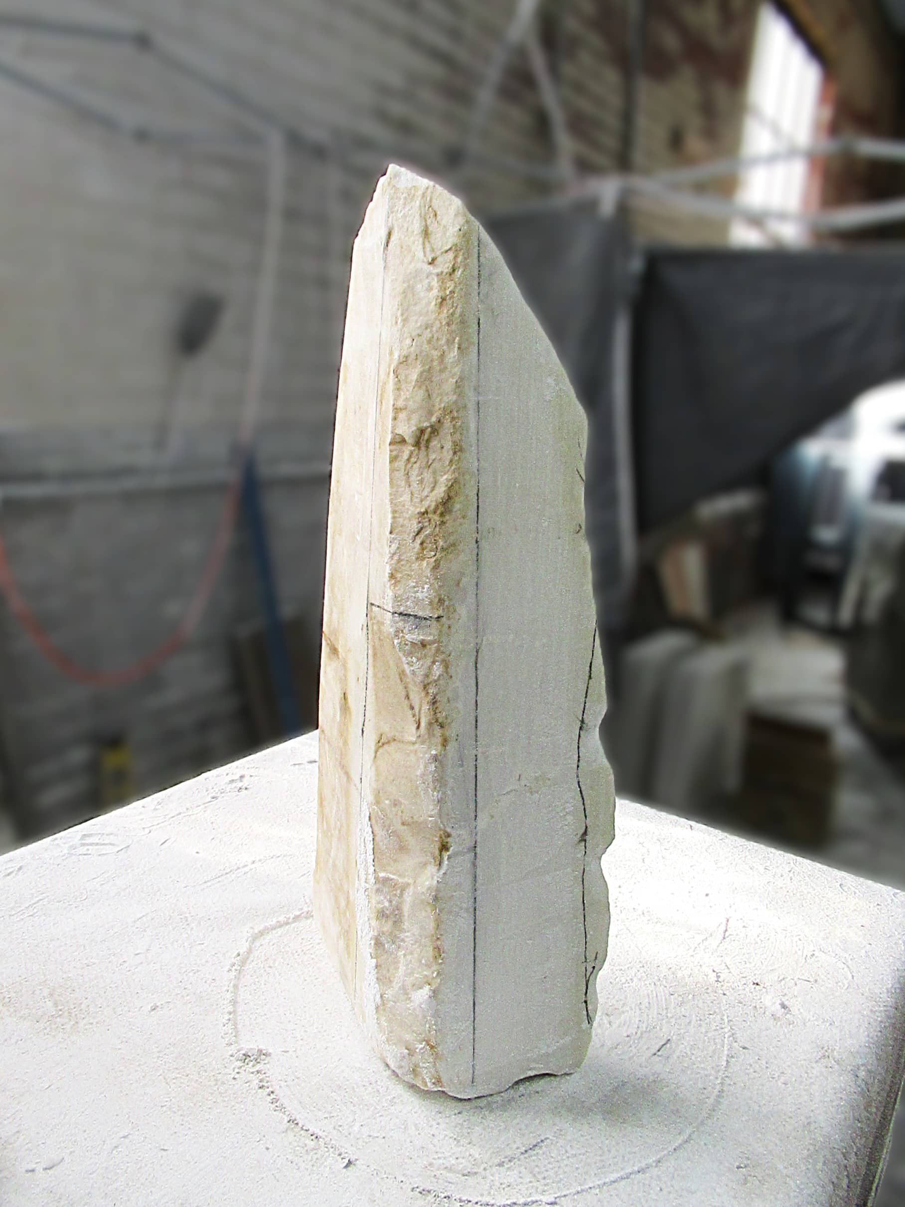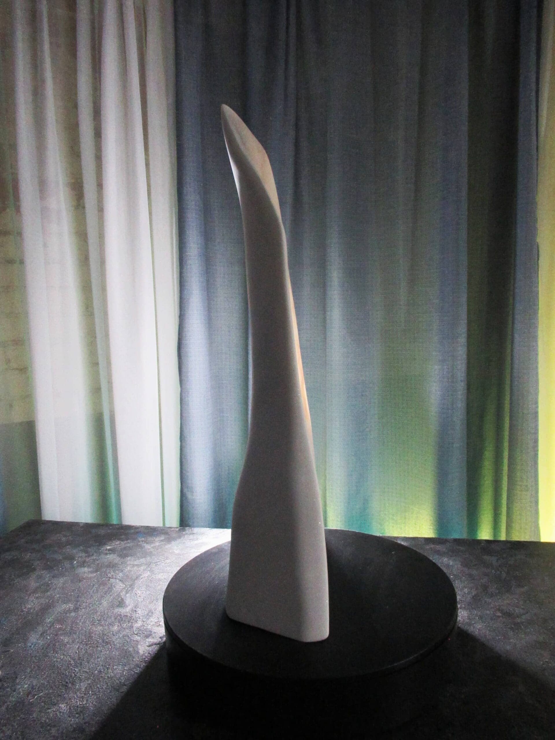 Vanishing Point reveals one of marble’s rarest qualities—its ability to transmit light. Carved as an ultra-thin sliver of Colorado Yule Marble, the sculpture allows light to pass through the stone, transforming solid marble into a shifting field of color, shadow, and translucence.