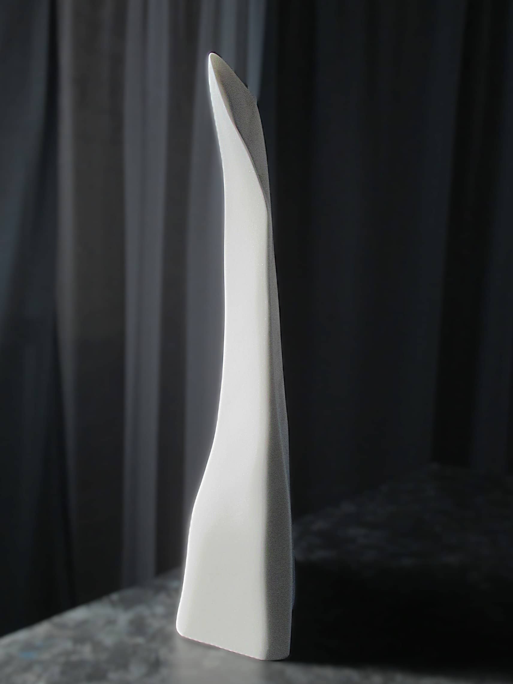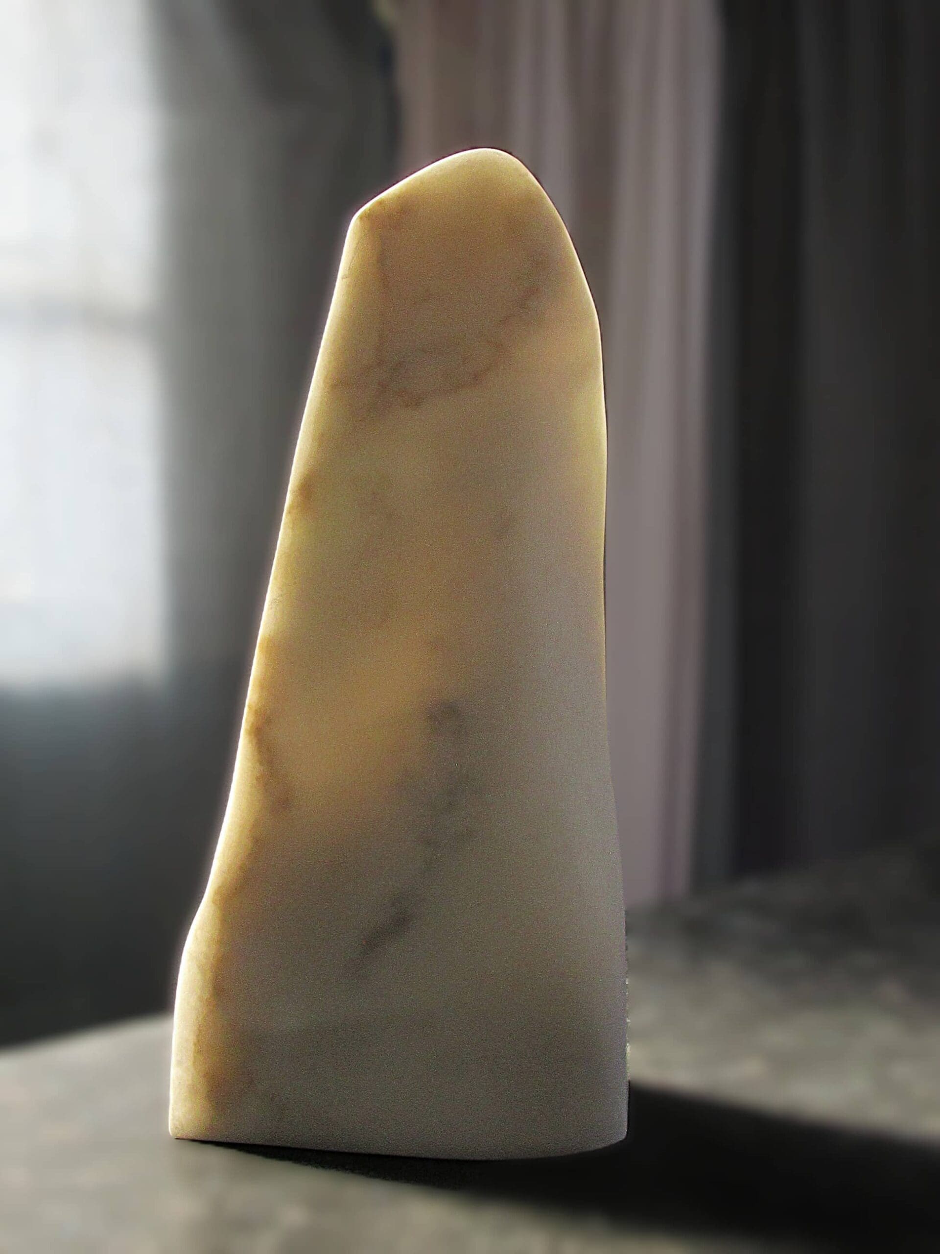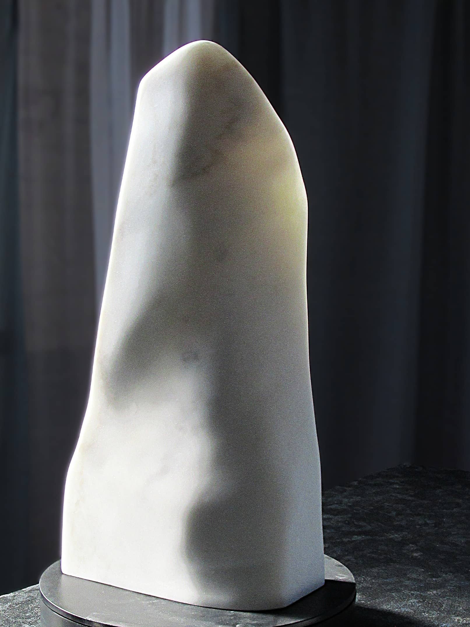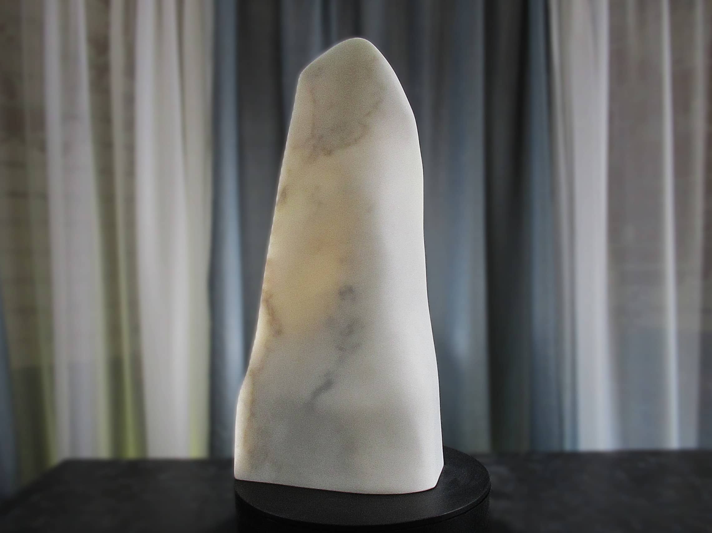 Viewed head-on, the form appears to dissolve as light animates the marble’s interior; from the side, the sculpture nearly disappears; and from the reverse, it returns to the familiar presence of solid white stone. The result is an ever-changing work that rewards movement, light, and time.